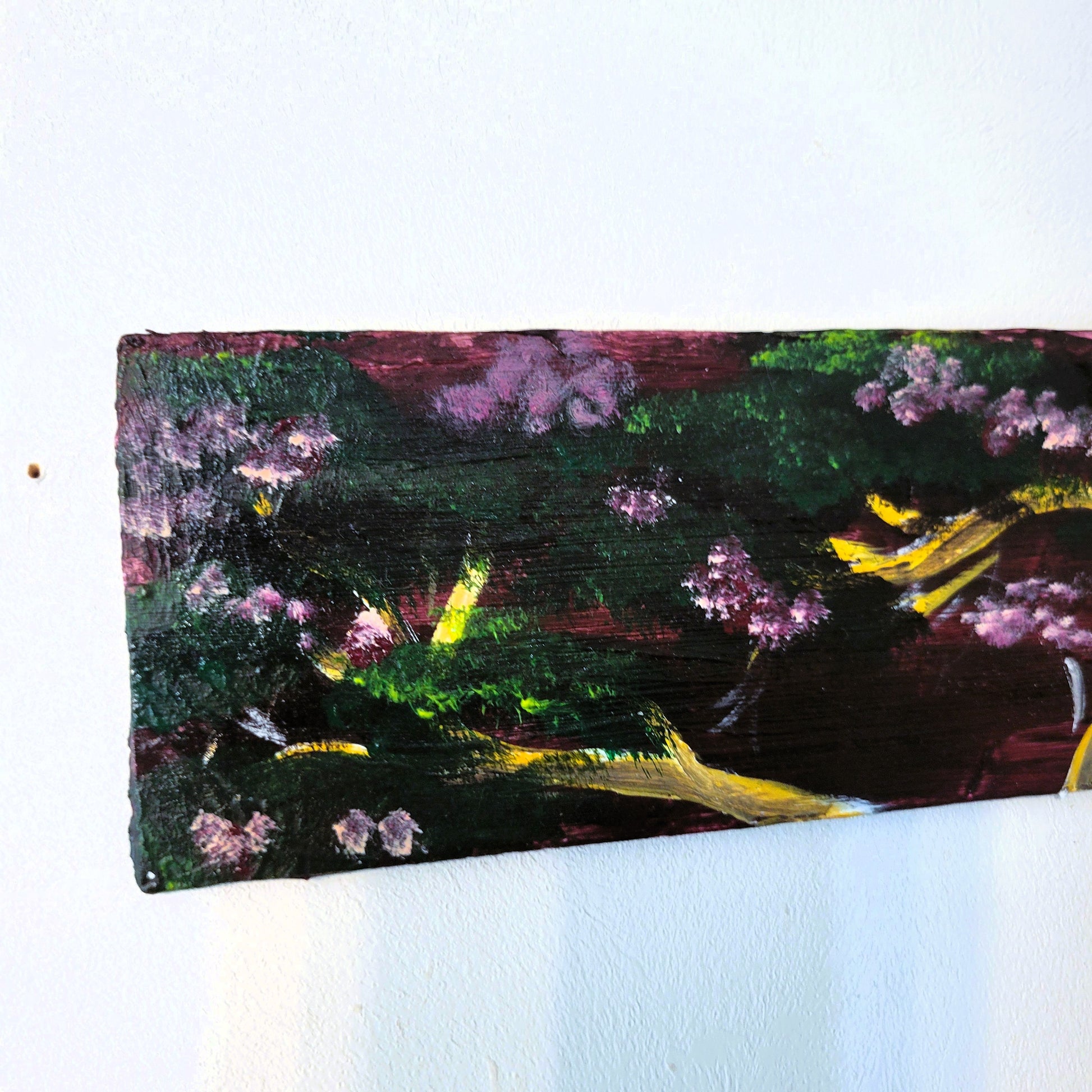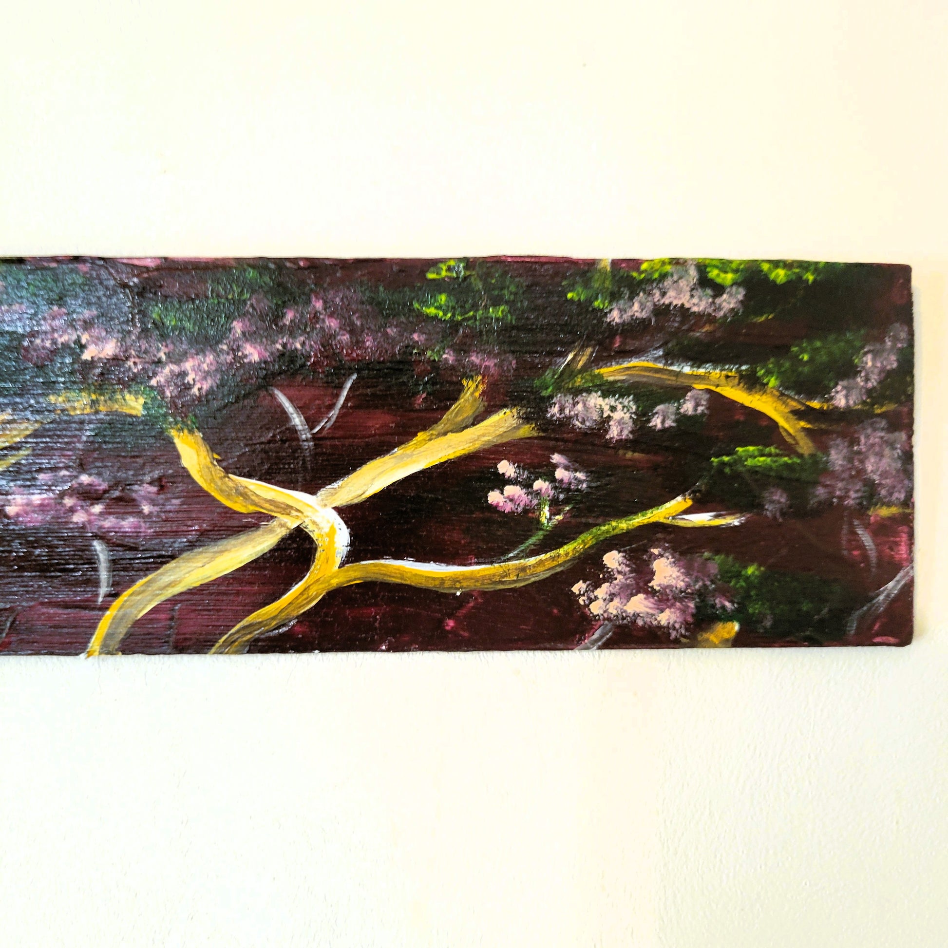 Add a pop of color and charm to any room with this hand-painted Blooming Wisteria Tree. Its vibrant pink flowers and glossy finish make it a unique and eye-catching piece. 12 inches wide and equipped with a hanger for easy installation. (No green thumb required!)