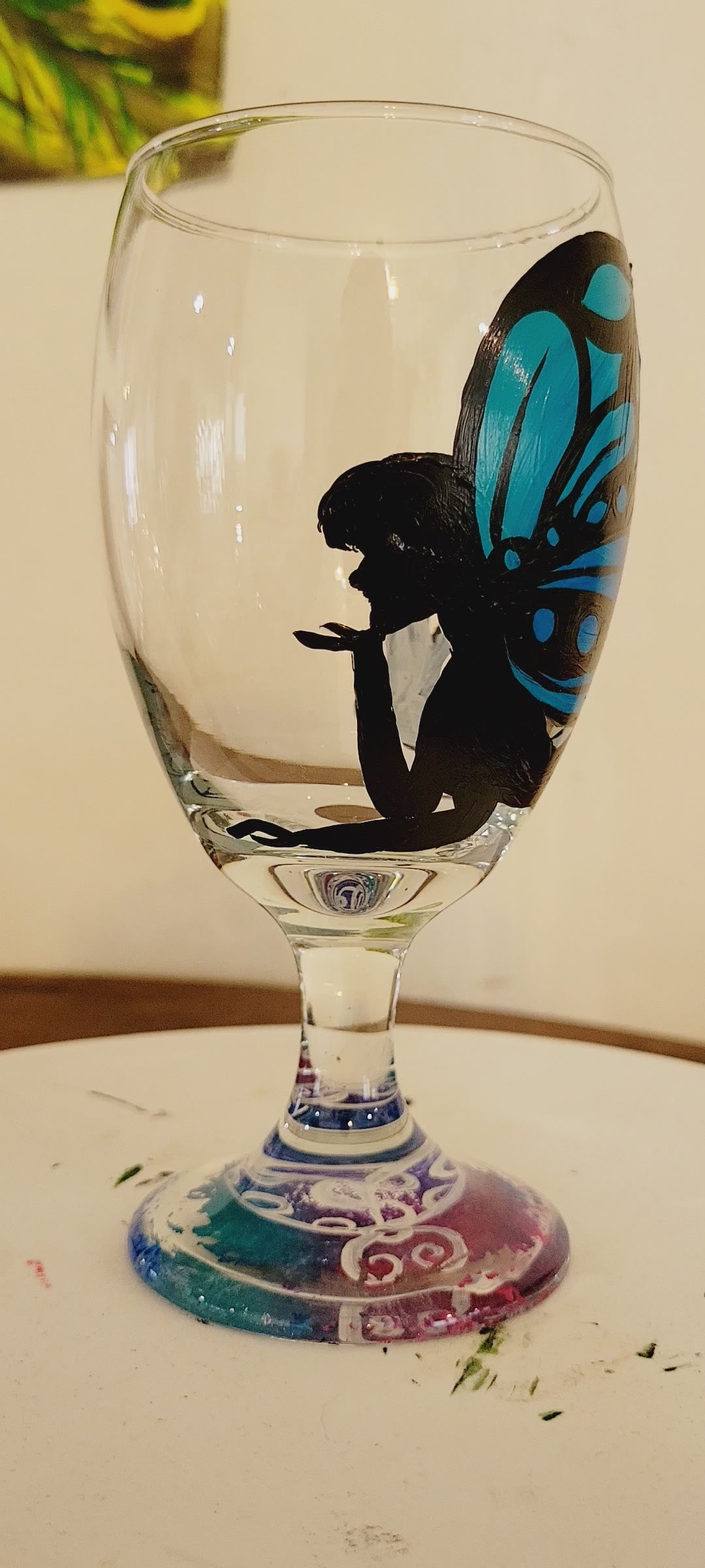 Add a touch of whimsy to your drinkware collection with our 16oz goblet wine glass featuring a hand-painted blue fairy with butterfly wings. This charming glass is not only dishwasher safe, but also comes boxed and shipped with UPS for convenience. Cheers to magical sips!