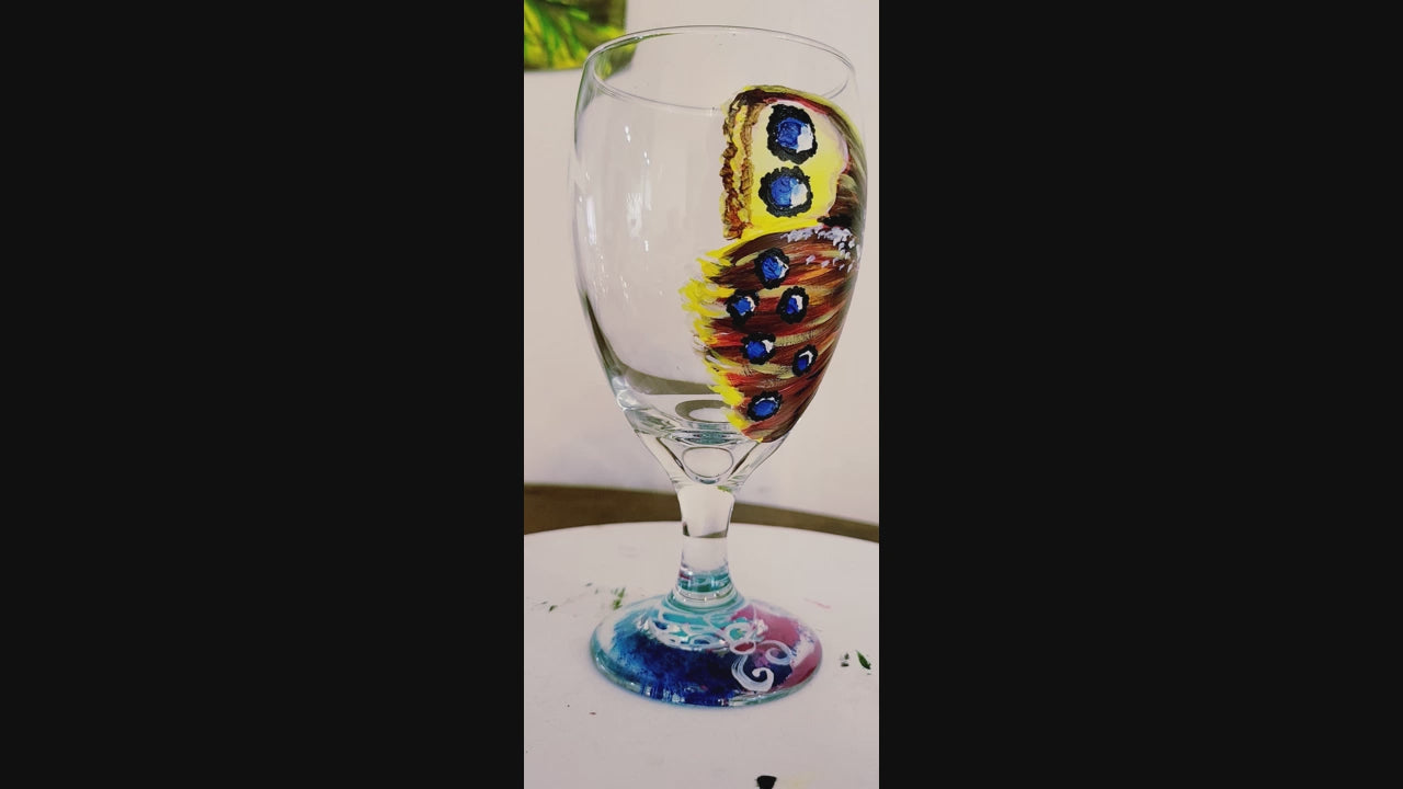 Introducing the Brilliant Butterfly wine glass - a bold and vibrant addition to your glassware collection. This 16oz goblet features a hand-painted yellow and brown butterfly with pops of red and blue accents. Dishwasher safe for convenience and shipped with UPS. A playful and unique twist on a classic design.