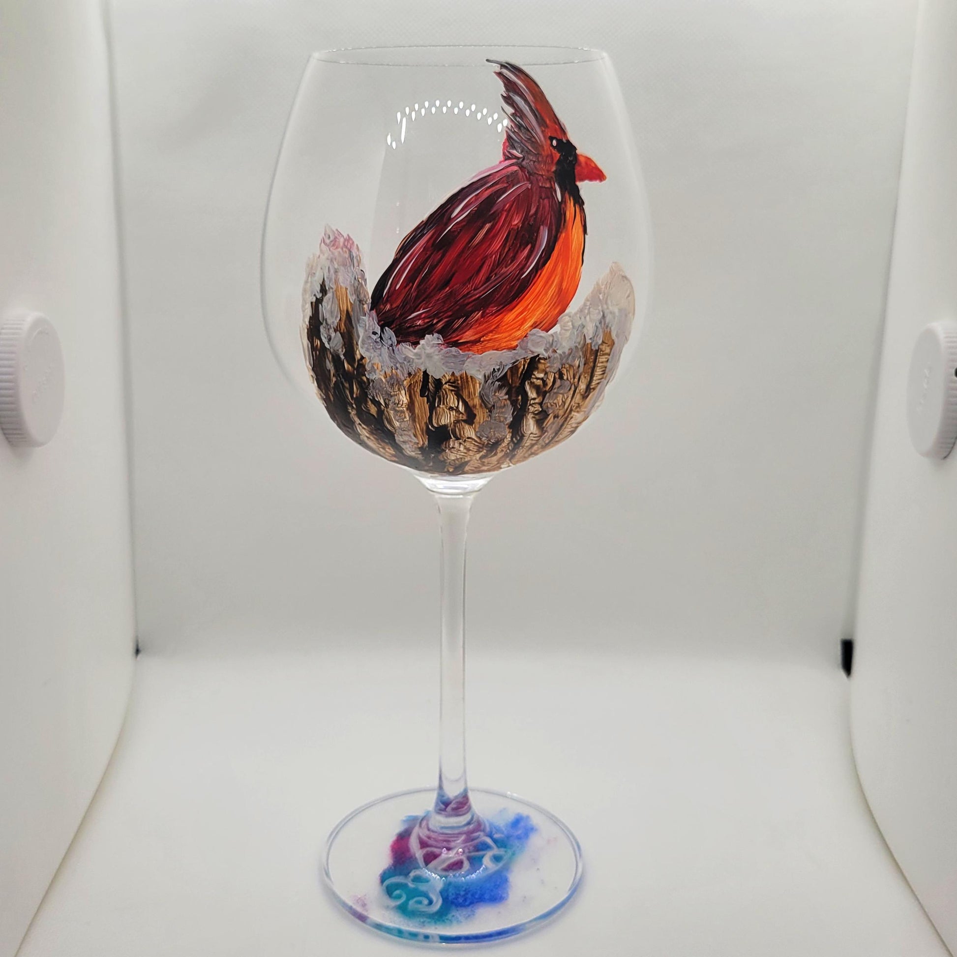 Experience the magic of nature with the Cardinal on a Snowy Stump Wine Glass! This elegantly crafted 24oz long-stem glass features a beautiful red cardinal perched on a snowy tree stump. Hand-painted and baked for dishwasher-safe durability, this glass will bring a touch of joy to your next wine night.