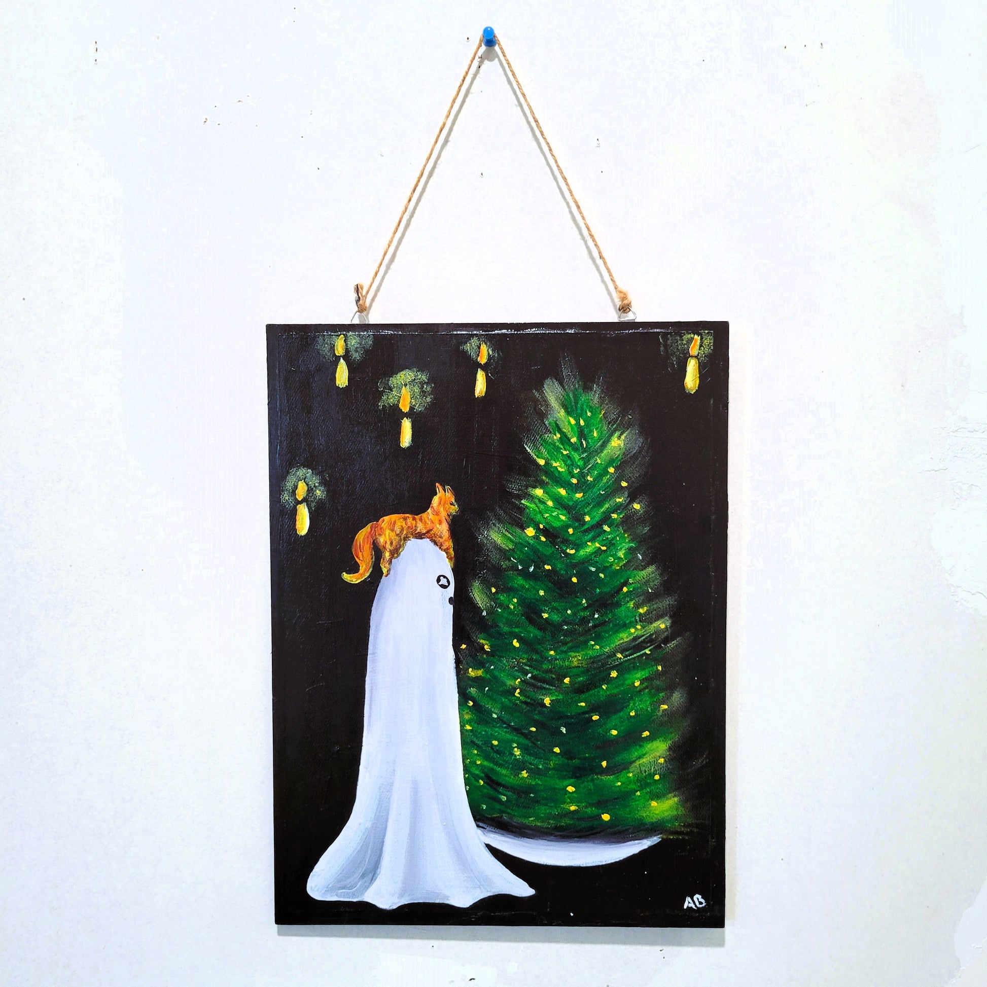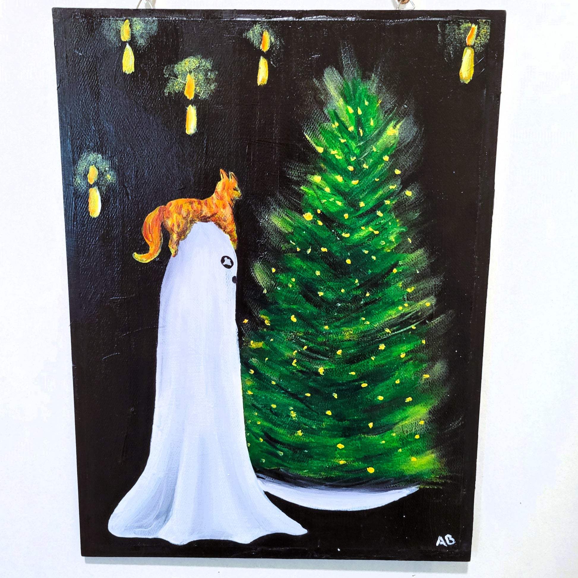 Experience the magic of Christmas with this original painting by Amy Bridges. Join Chester, the friendly ghost, and his orange cat Boo as they gaze in wonder at a beautifully decorated Christmas tree. Add a touch of whimsy to your holiday decor with this charming artwork.