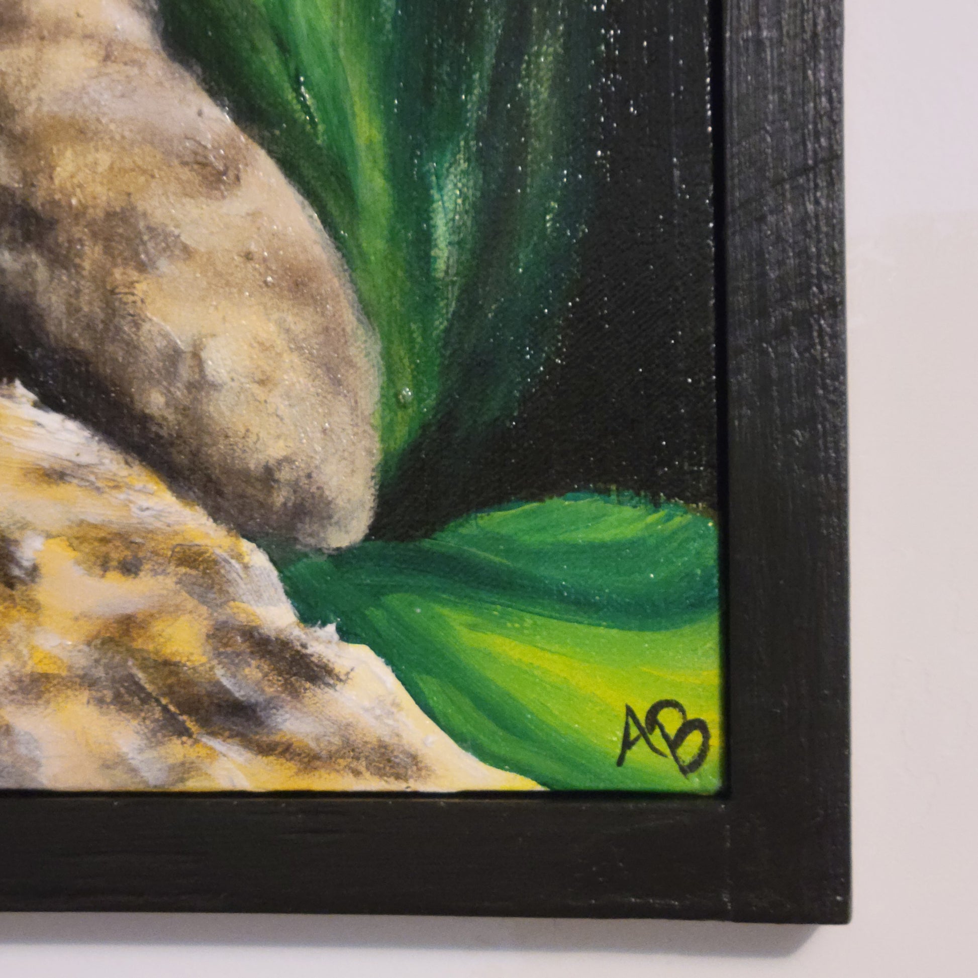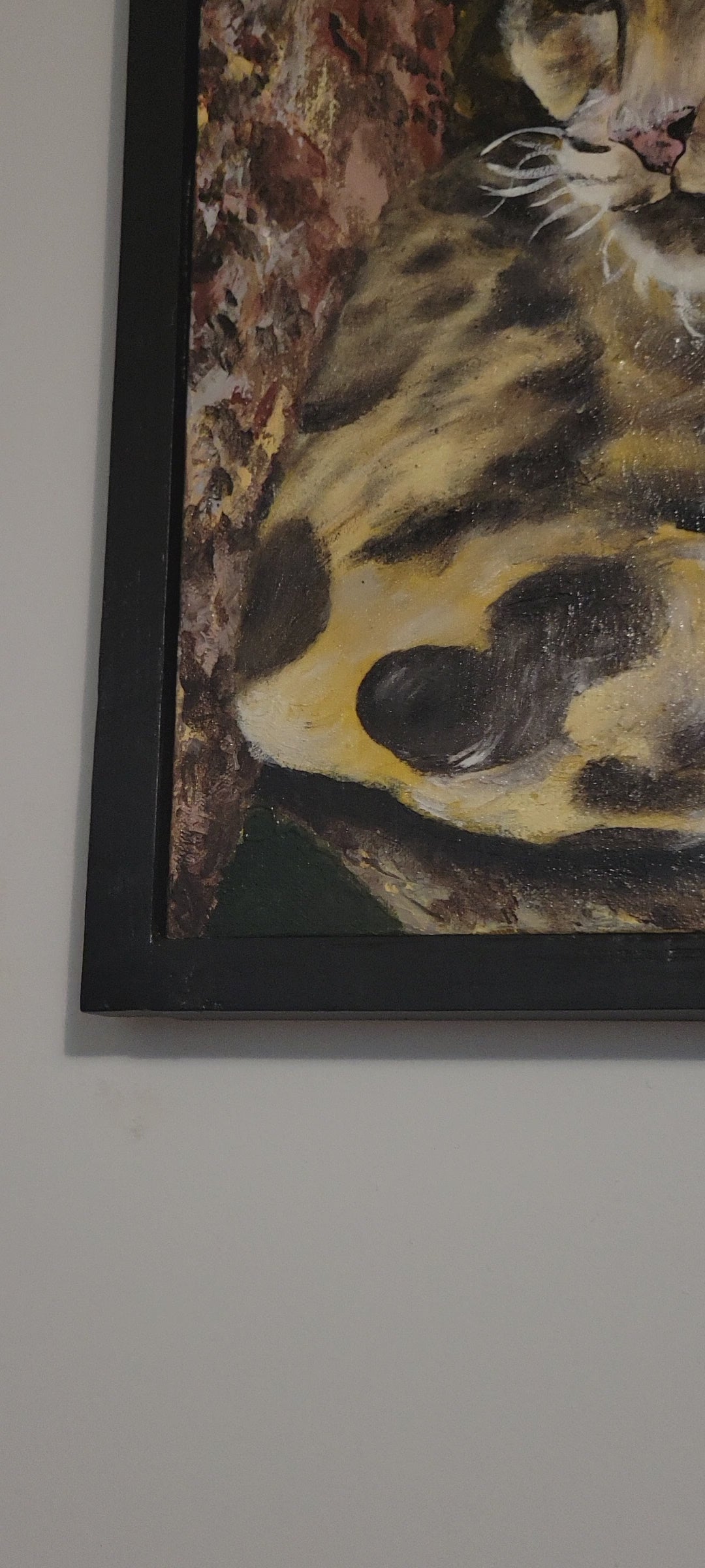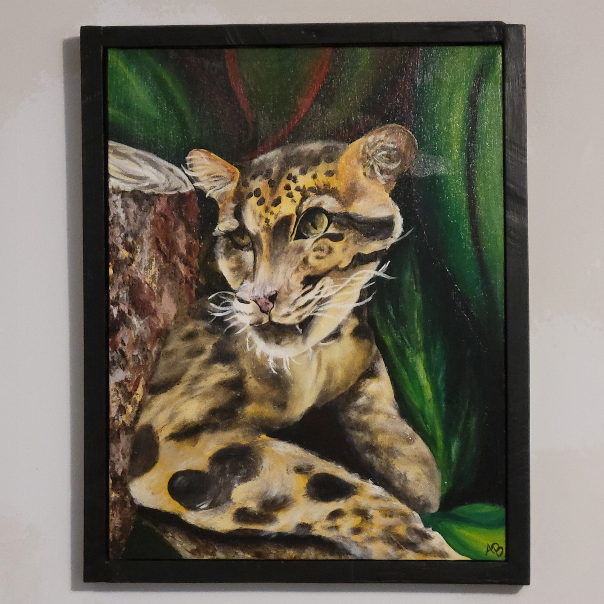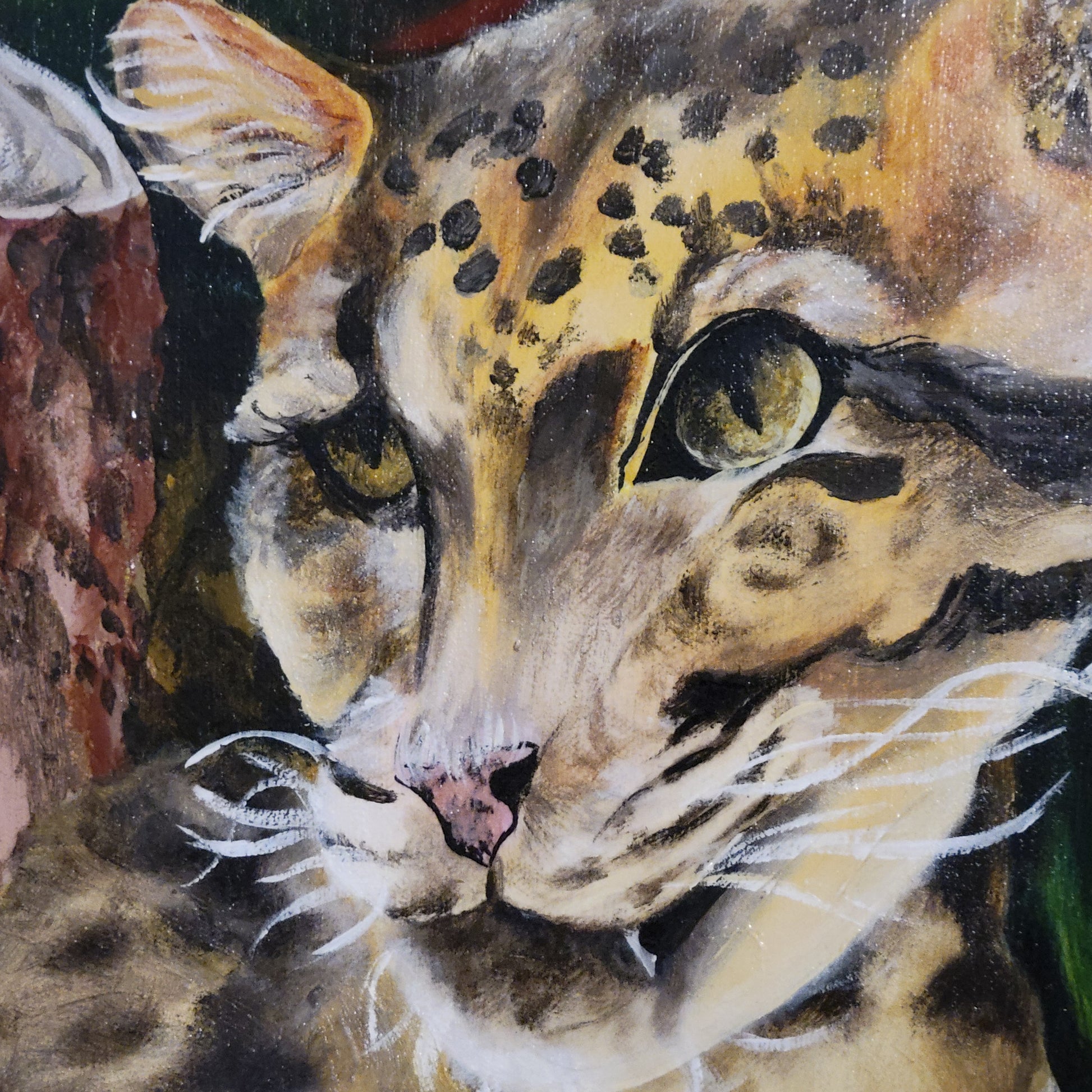 "Clouded Leopard" is an original, acrylic painting. It is in a handmade frame, wired, and ready to hang. I used various texture paint mixtures to create a more lifelike fur texture. I was inspired by this incredible wild animal that is actually located at my local zoo. I'm there with my family all the time. This big cat is fascinating to watch. I took around 200 pictures before I was able to piece together a painting that I felt captured his magnificence. What you see in this painting is the final product and I hope you can see just how incredible the clouded leopard is.