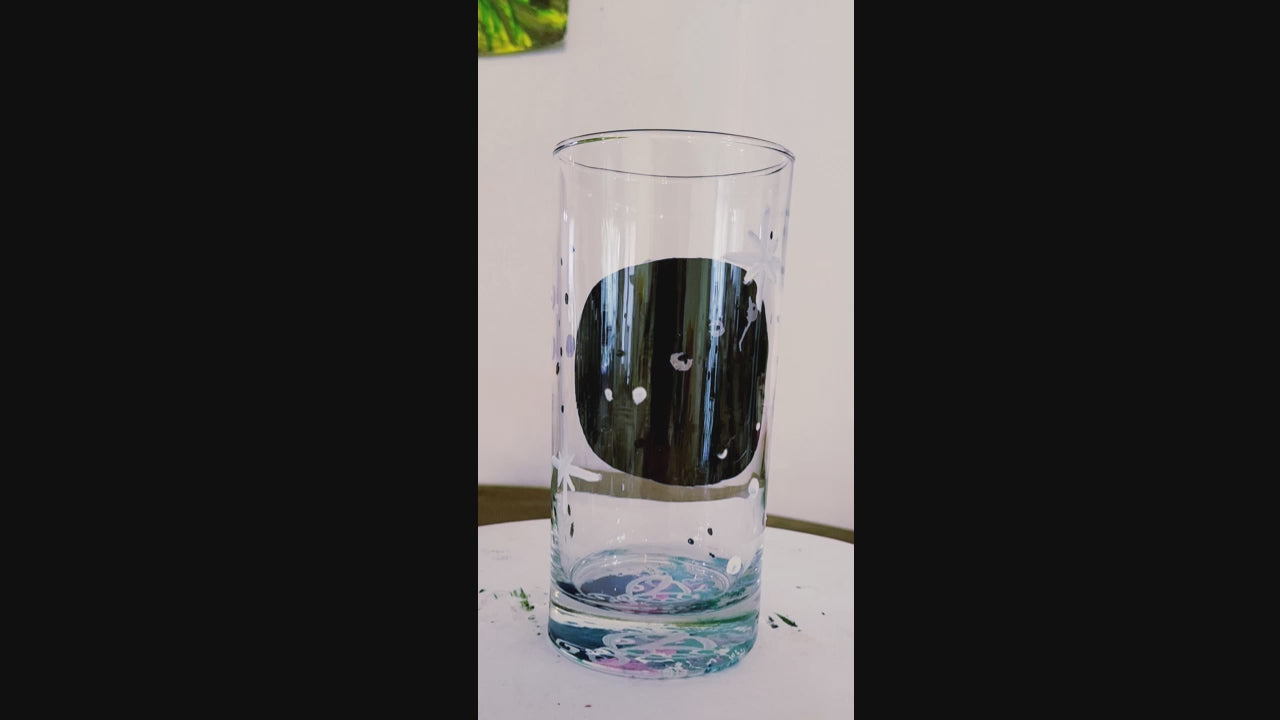 Enjoy your favorite drinks with our Full Moon and Stars 16oz Highball Glass. Hand-painted with a celestial design, this glass holds up to 16oz and features full wraparound artwork. Go ahead and put it through the dishwasher - our baked-on finish ensures it stays looking stellar.