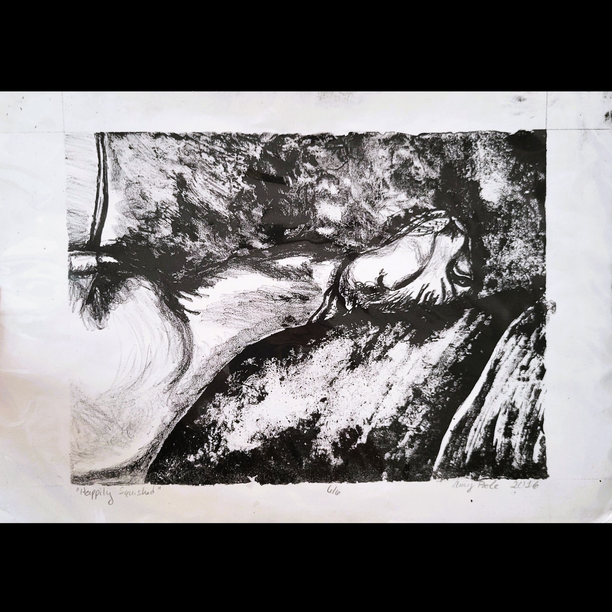 "Happily Squished" is a black and white lithograph I made in March 2016. This is a cat I had at the time. His name was Snowball and his favorite place to be was halfway underneath me when I sat down.