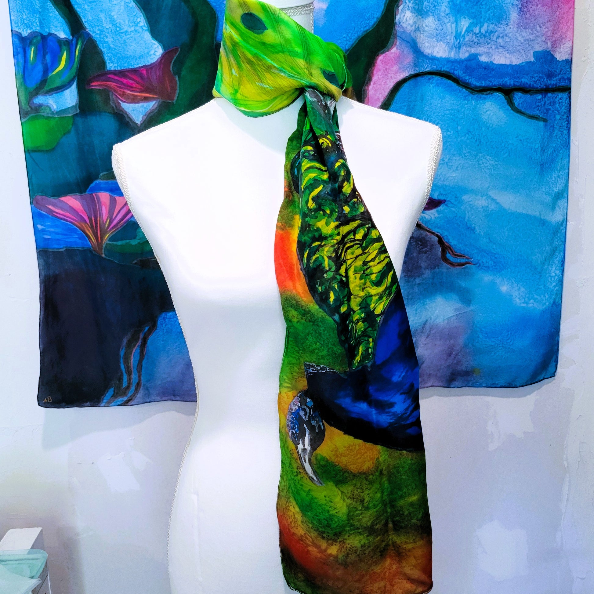 Bring the elegance of fine art into your wardrobe or home décor with this original hand-painted habotai silk scarf, titled “Peacock in the Grass.”