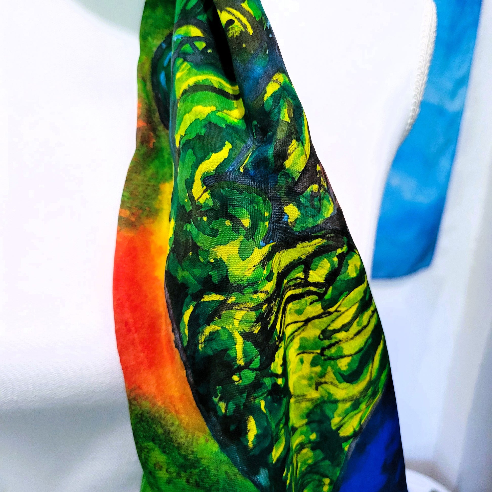 Every scarf is made 100% by hand. I cut the fabric, hand-paint the scarf, and sew everything myself. Every scarf is also a completely unique, wearable work of art.