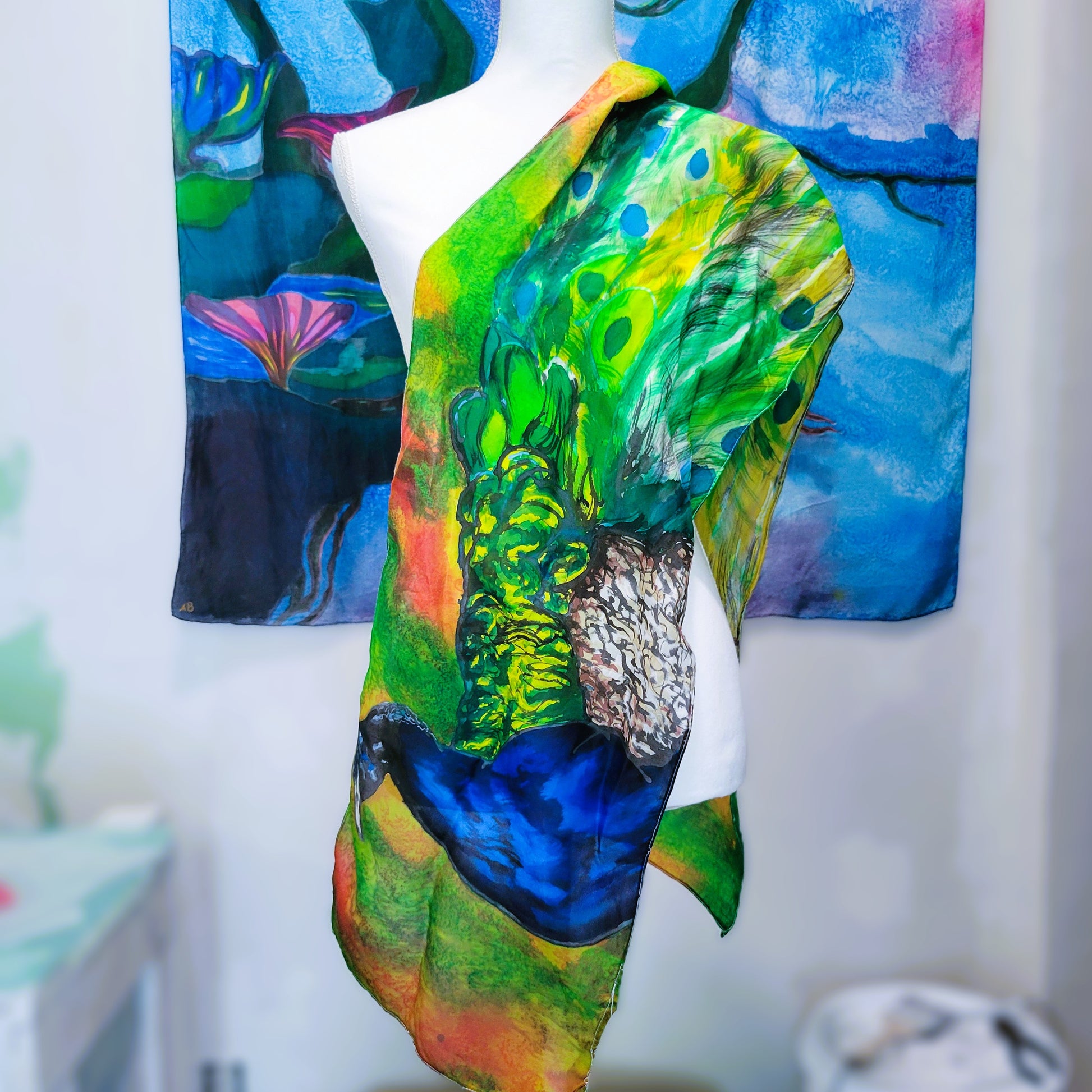 This scarf is more than an accessory—it’s wearable fine art and a one-of-a-kind gift for art lovers, fashion enthusiasts, or anyone who appreciates the beauty of a peacock’s elegance.
