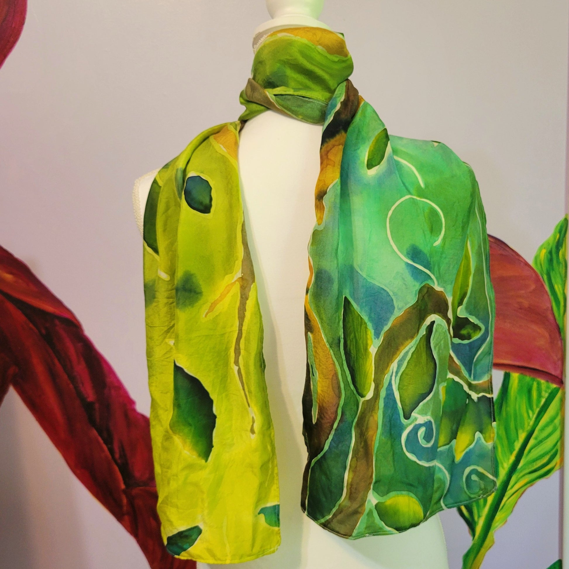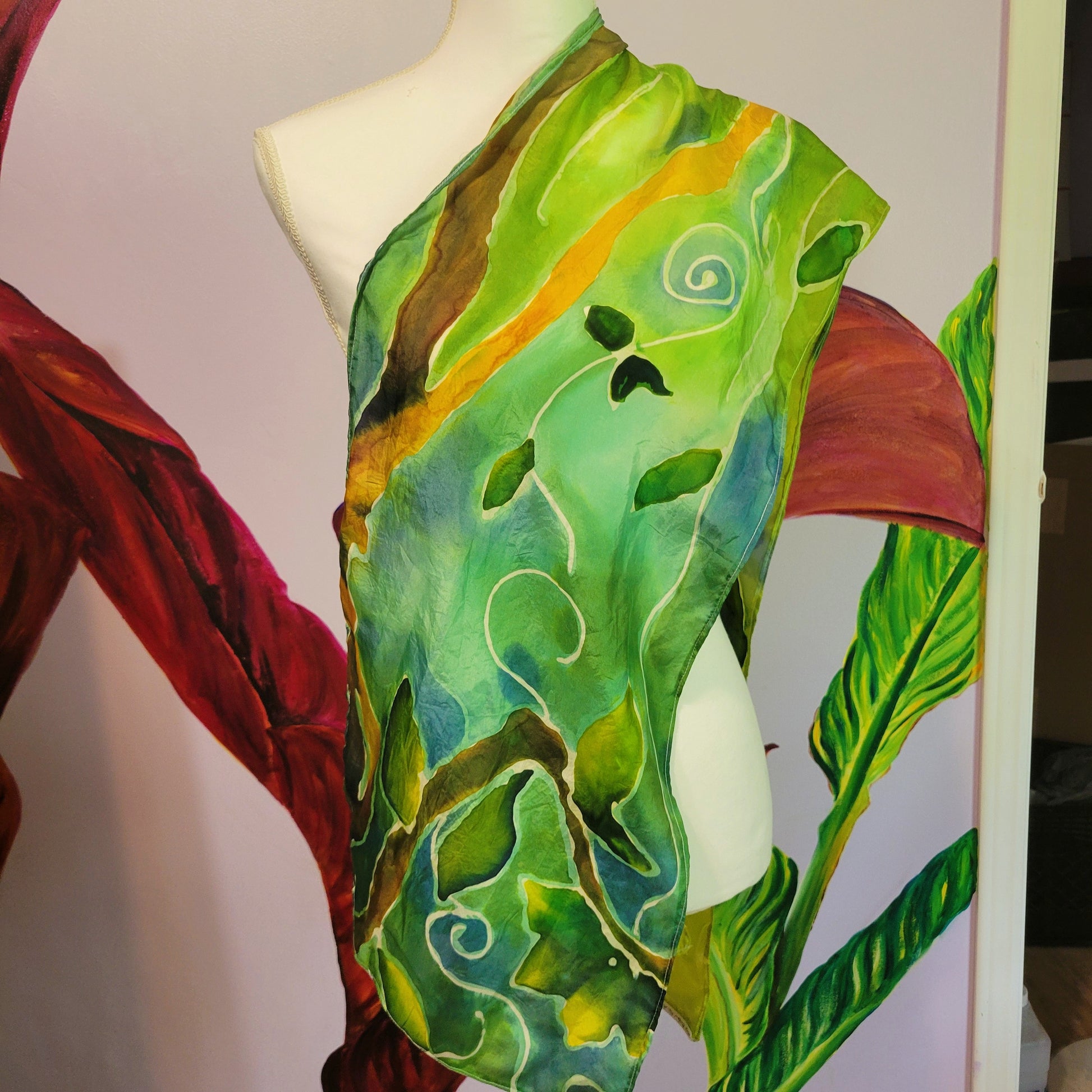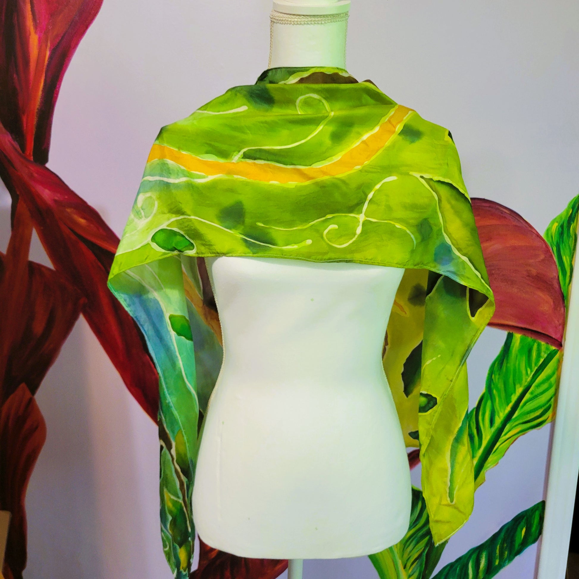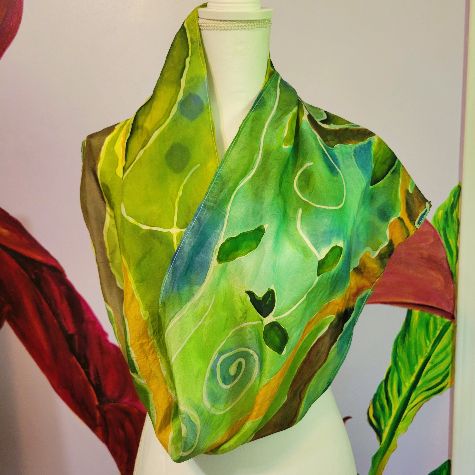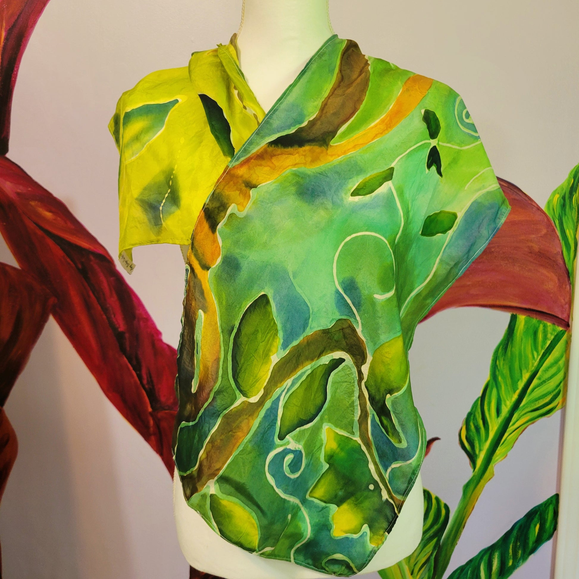 Pixie Hollow – Hand Painted Habotai Silk Scarf, Green Vine & Leaf Design, Artisan Wearable Art Shawl