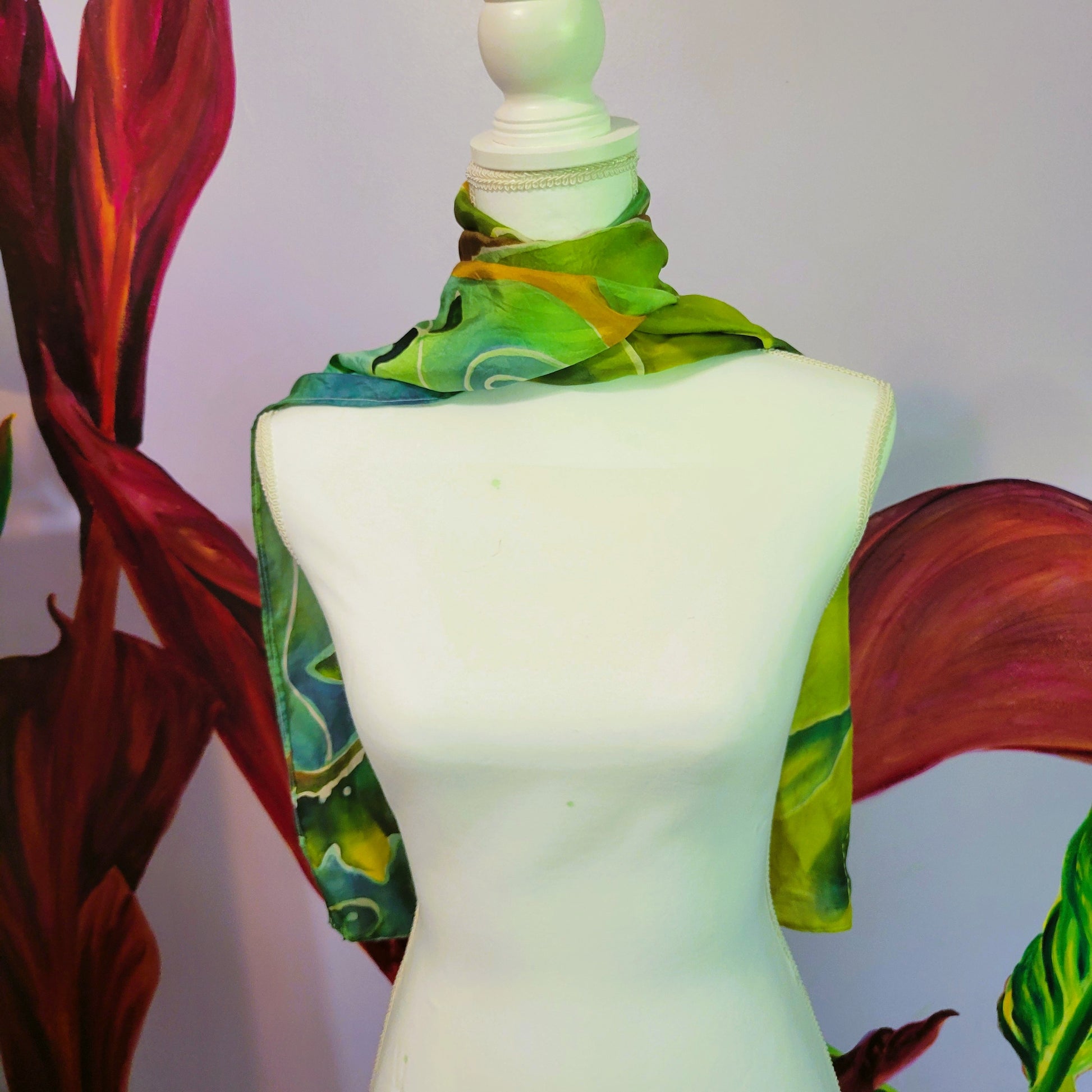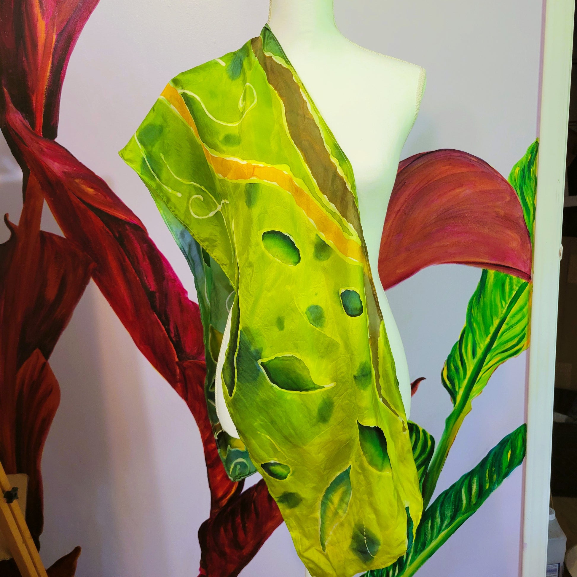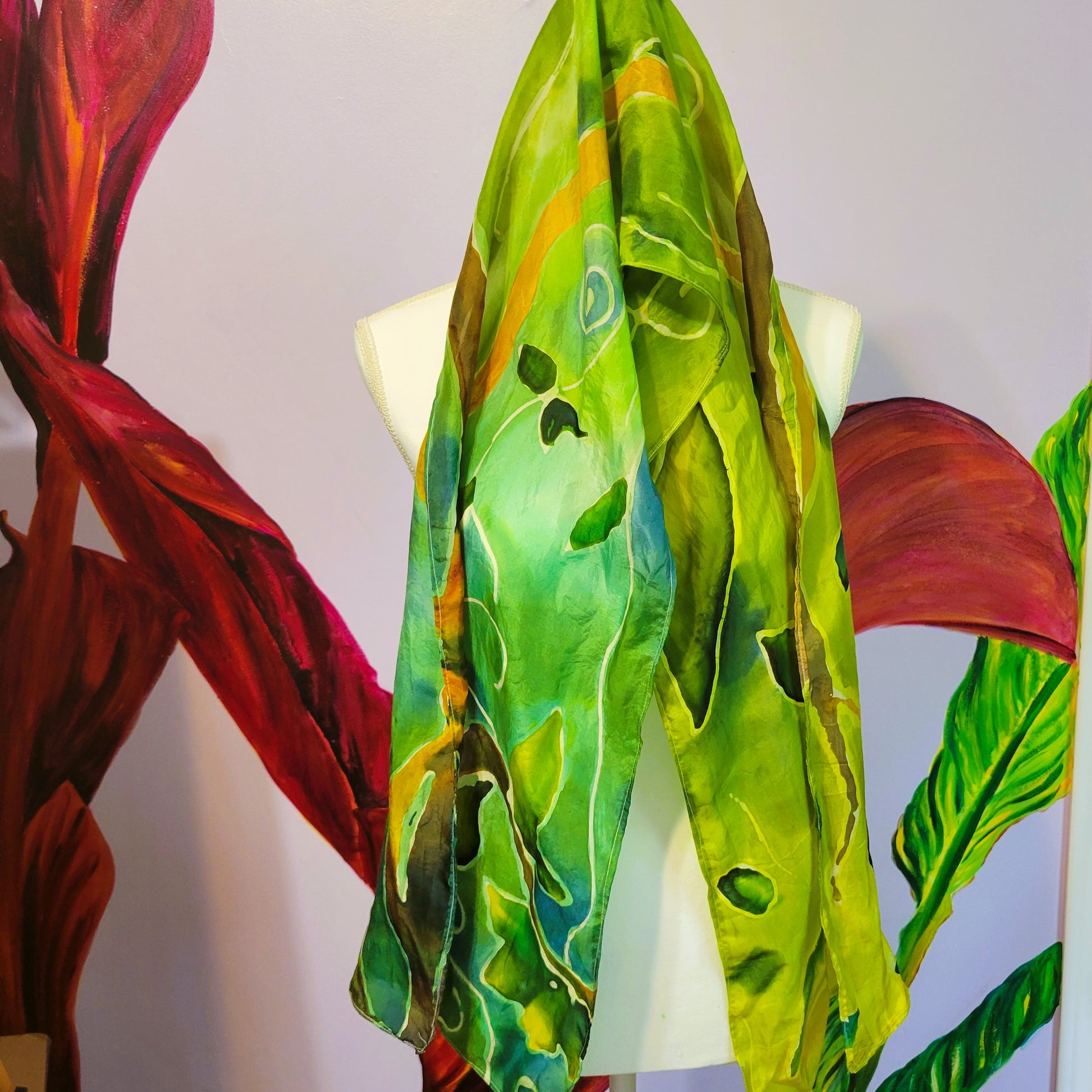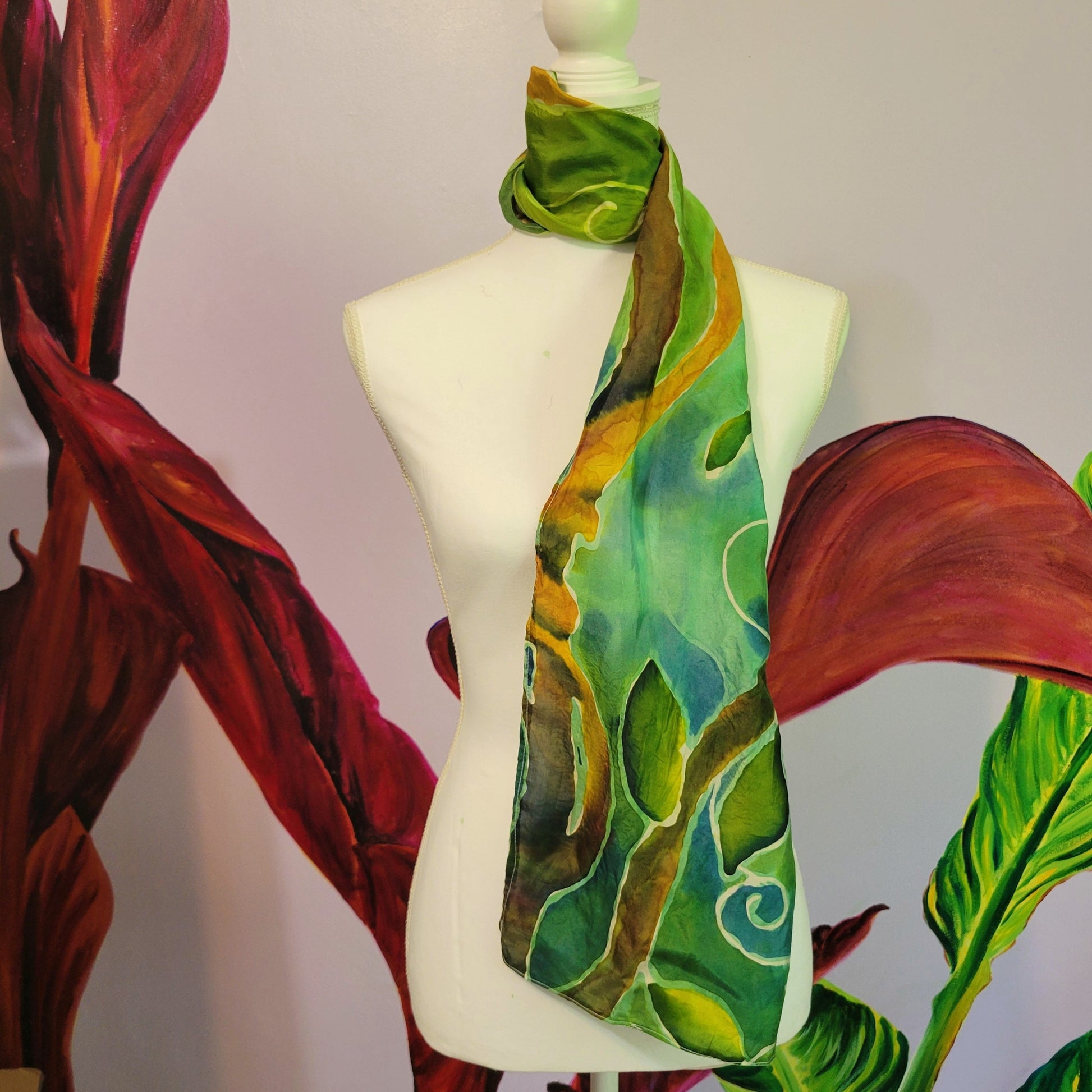Pixie Hollow – Hand Painted Habotai Silk Scarf, Green Vine & Leaf Design, Artisan Wearable Art Shawl