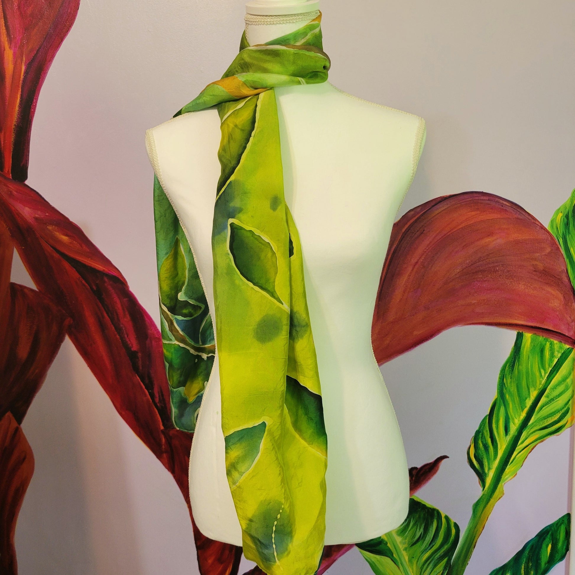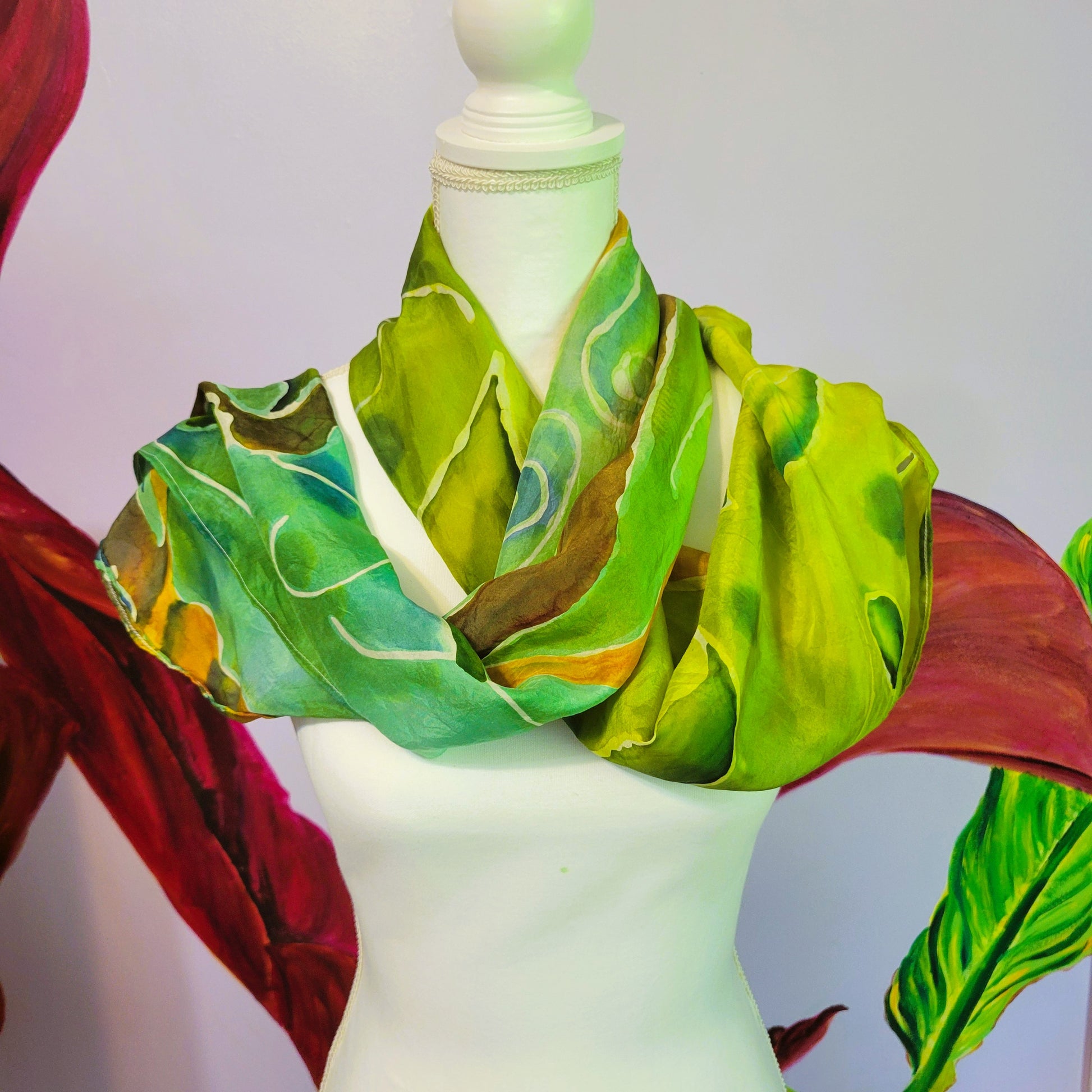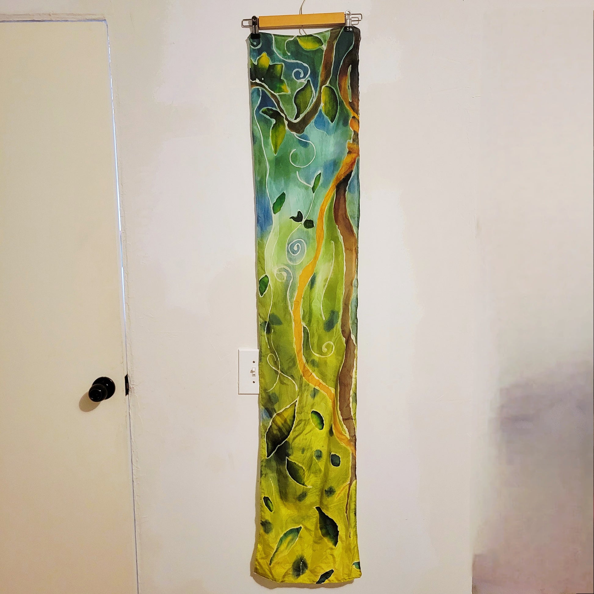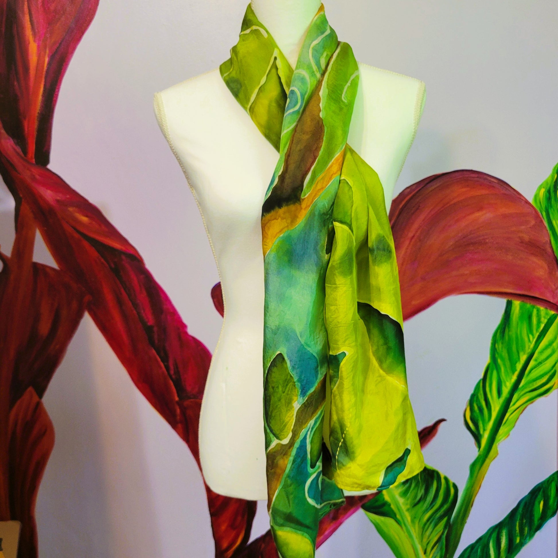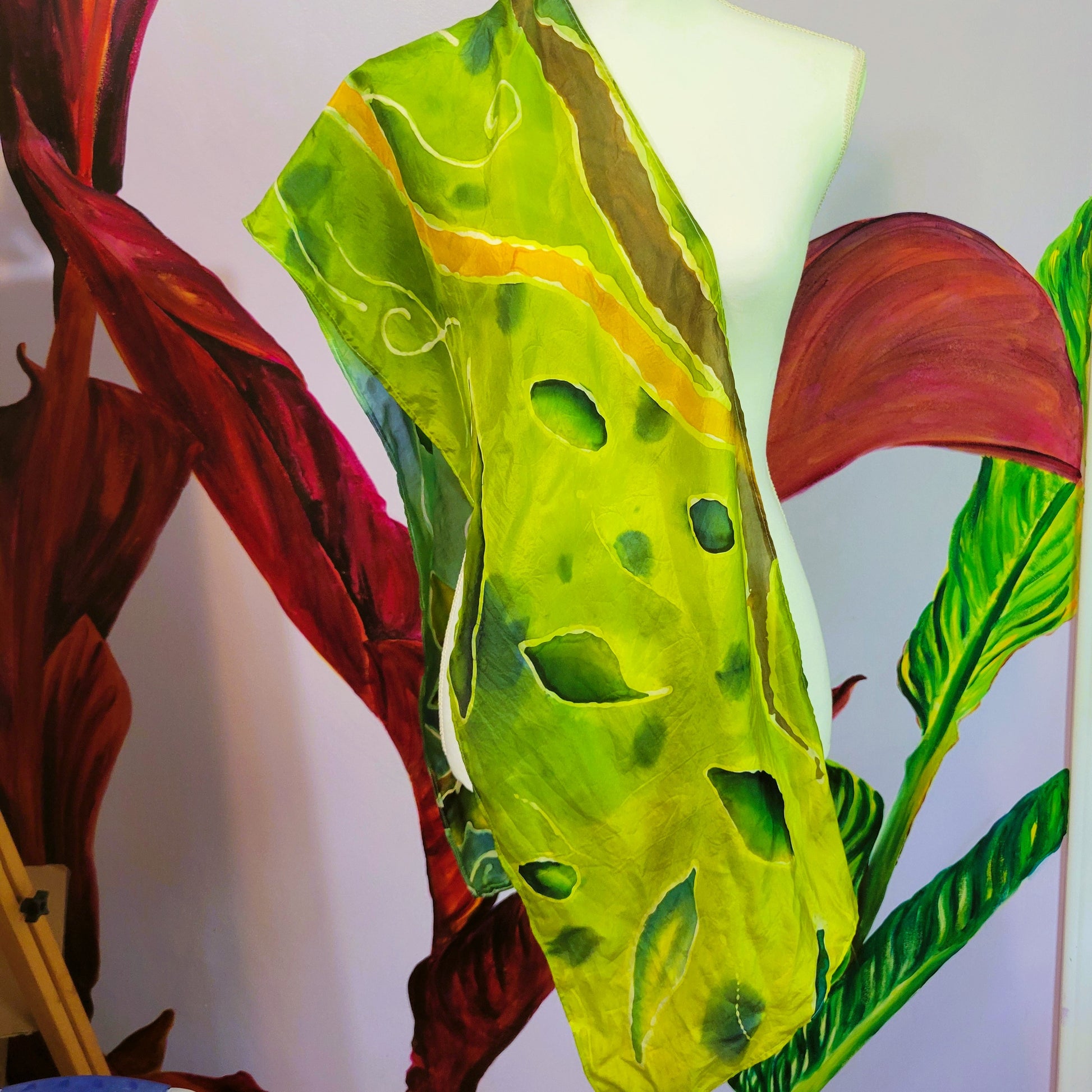 Pixie Hollow – Hand Painted Habotai Silk Scarf, Green Vine & Leaf Design, Artisan Wearable Art Shawl