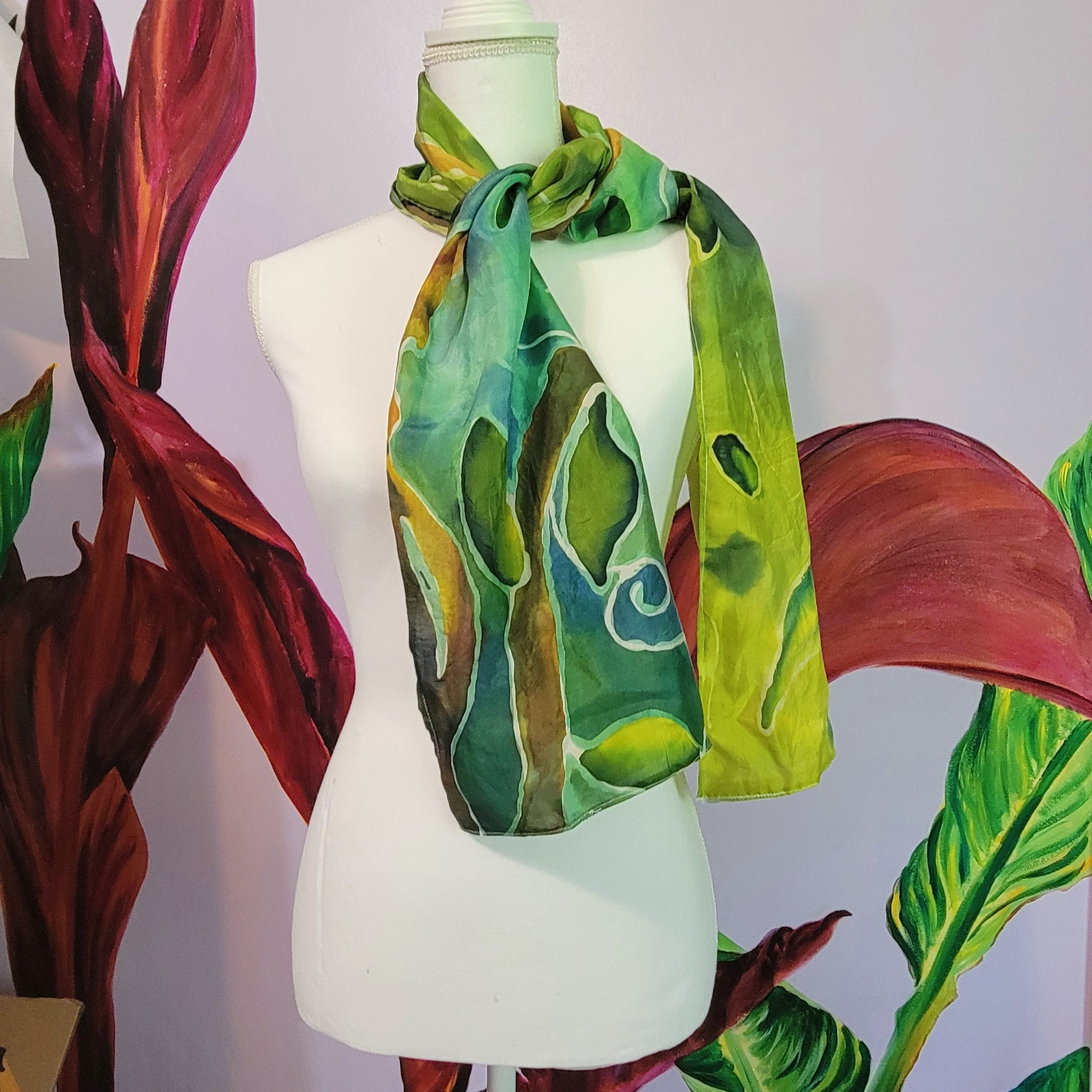 Step into a touch of magic with Pixie Hollow, a hand-painted habotai silk scarf that brings the beauty of nature to life. Crafted with care, this wearable artwork features a lush dark green to golden yellow gradient background, adorned with flowing vines, delicate leaves, and subtle white swirls that let the natural silk shine through. The result is a fairy-tale-inspired design that feels both enchanting and timeless.