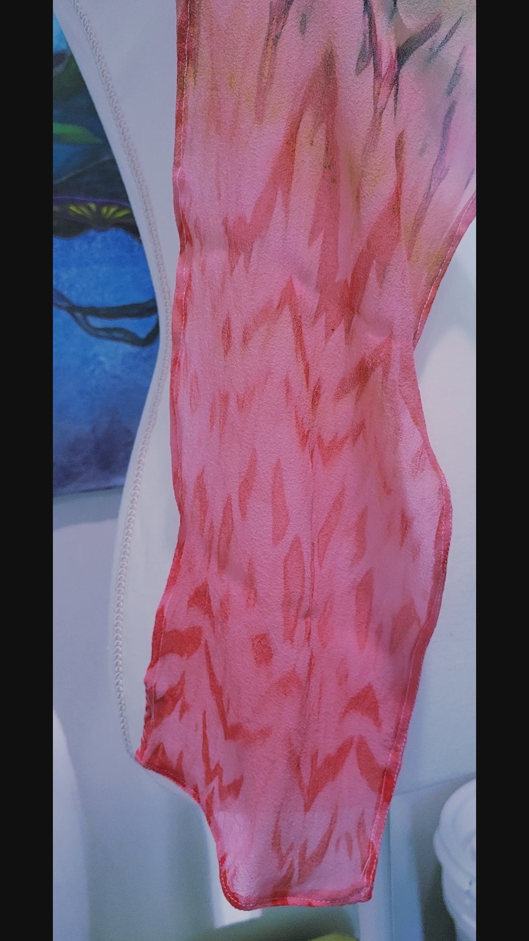 Elevate your wardrobe with the new Red and Blue Texture Silk Chiffon Scarf. Hand-dyed with red, yellow, and blue hues, this scarf was inspired by the colors and scenery I saw while driving to Lubbock, Texas from East Texas. The scenery and landscapes were so different from anything I had seen before. The vast openness of the landscape created its very own color blends where ground met sky and shapes met the flat earth. Created by tightly wrapping the fabric around a pole, this scarf is a one-of-a-kind addition to any outfit. I could repeat the wrapping process and use the same colors over and over, and the results would never be identical.