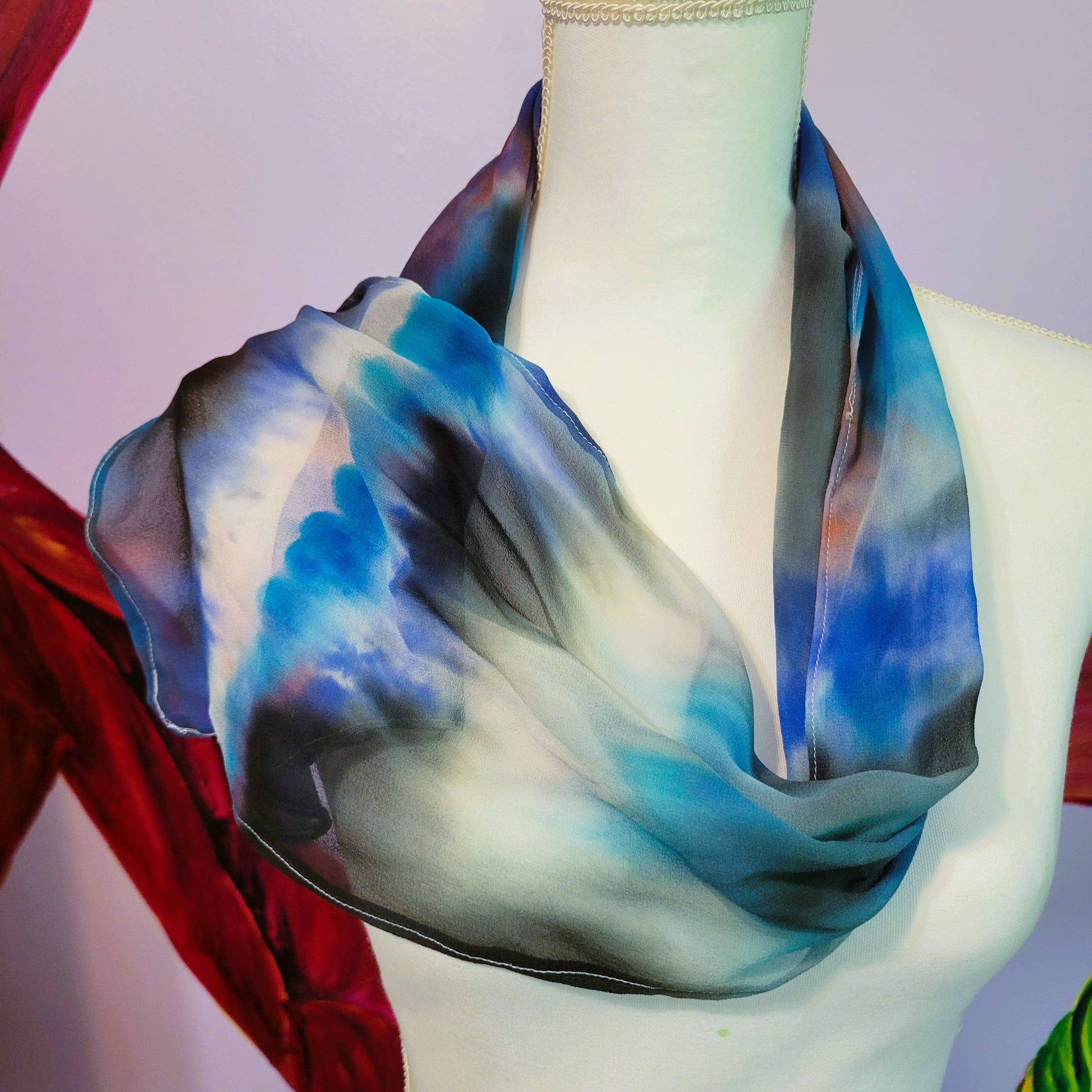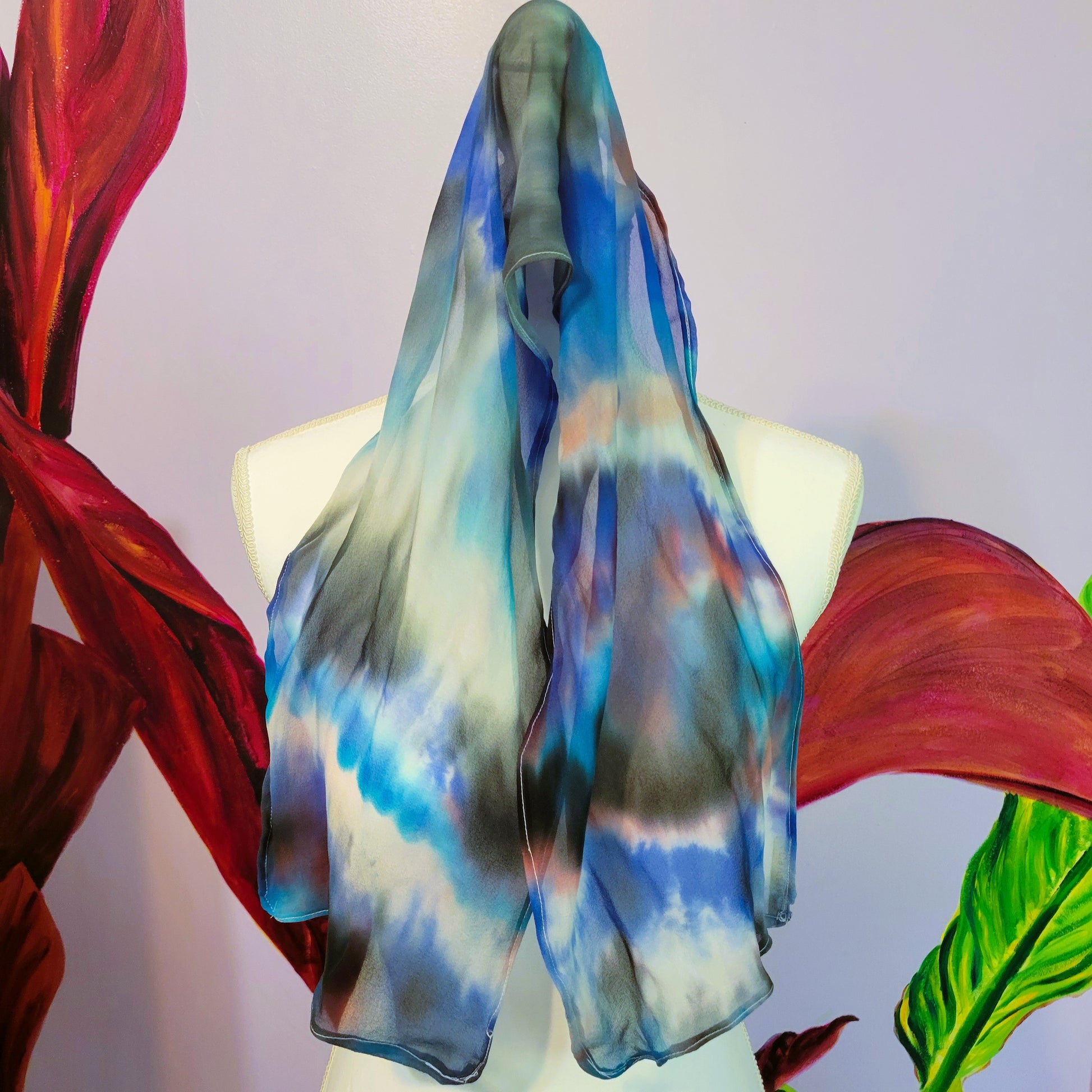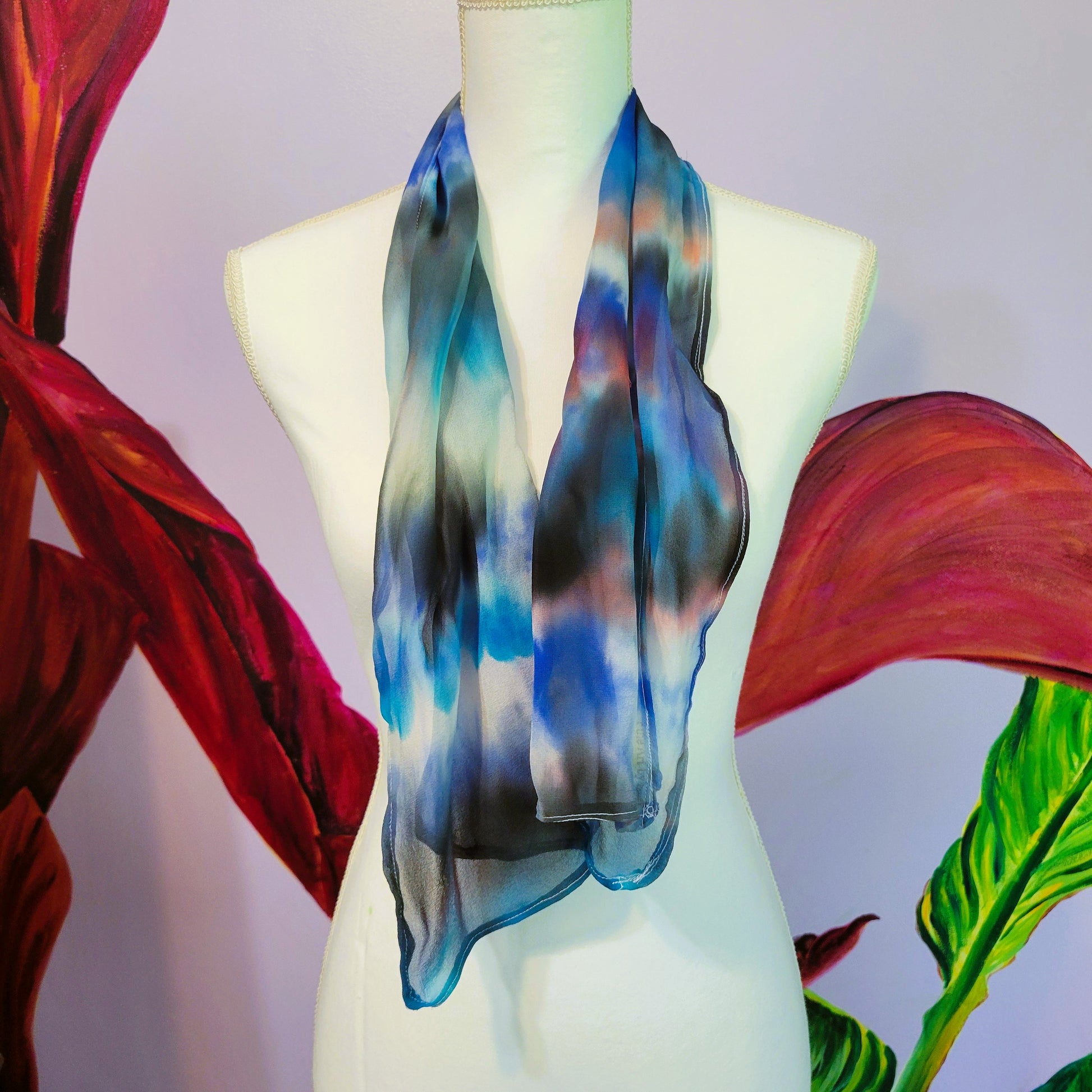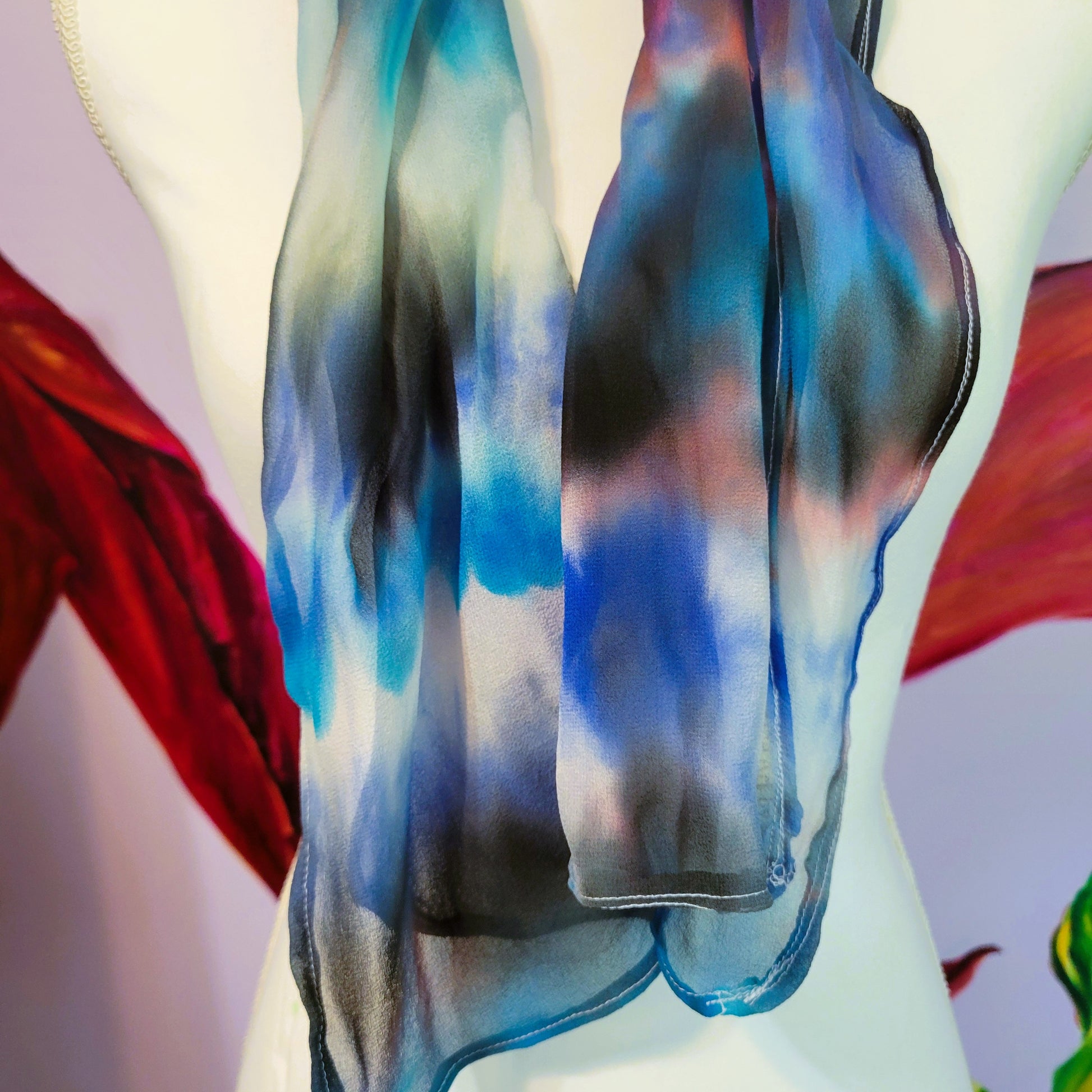Elevate your style with this hand painted silk chiffon scarf, a one-of-a-kind wearable art piece. Crafted from luxurious sheer silk chiffon, this scarf features an abstract watercolor-inspired design in shades of blue, black, red, and white, created through a unique scrub-dye painting technique.