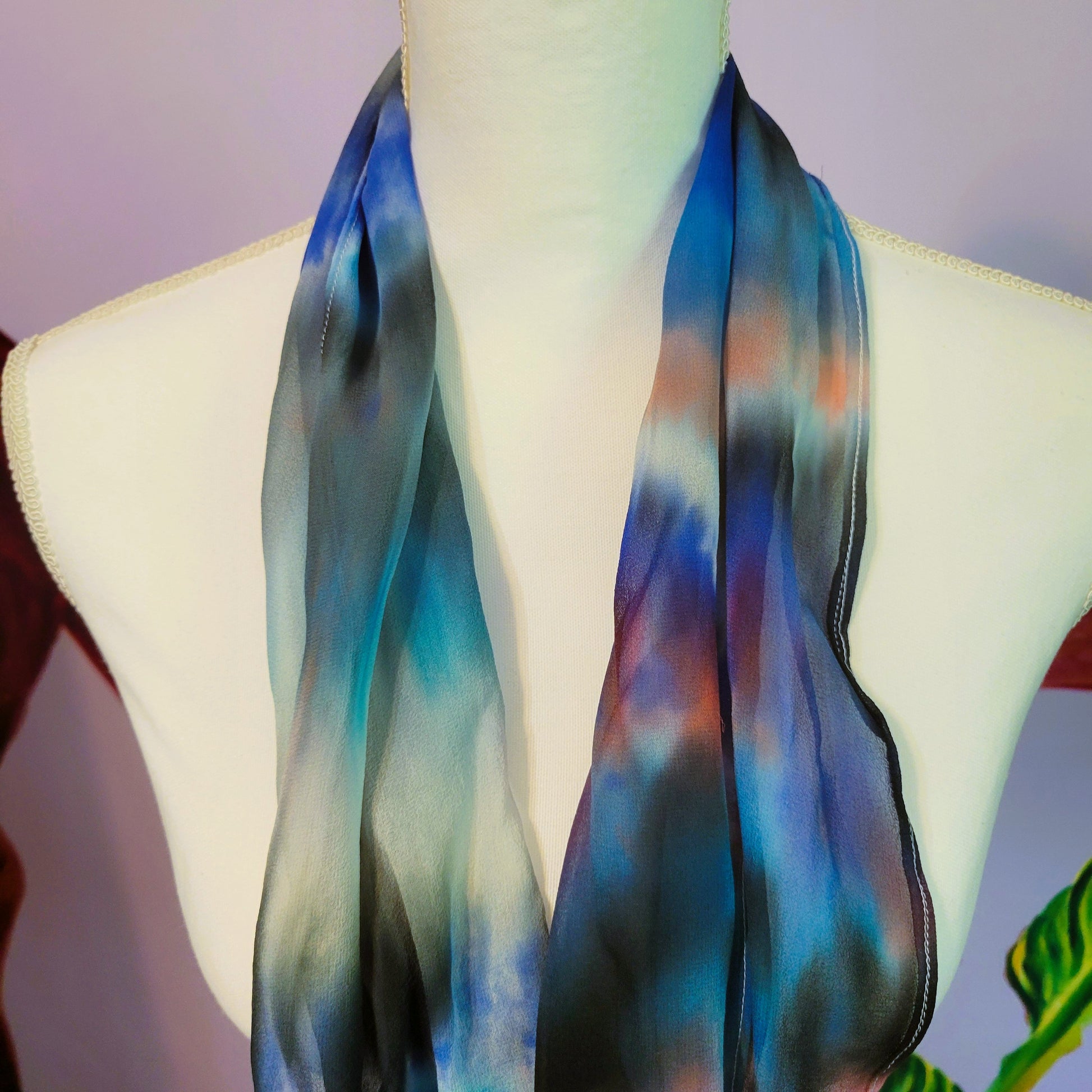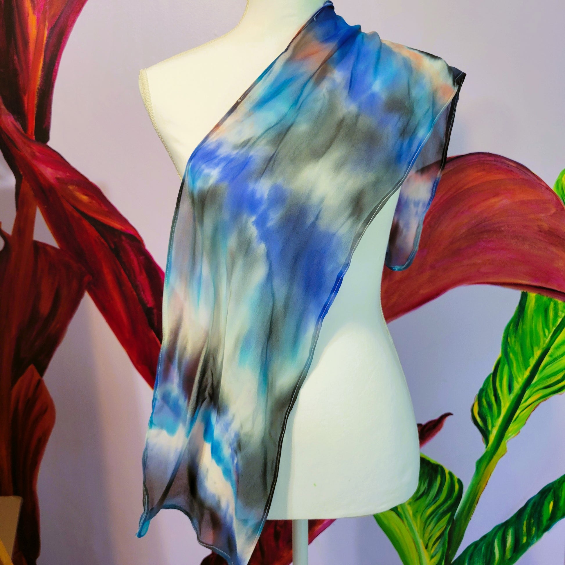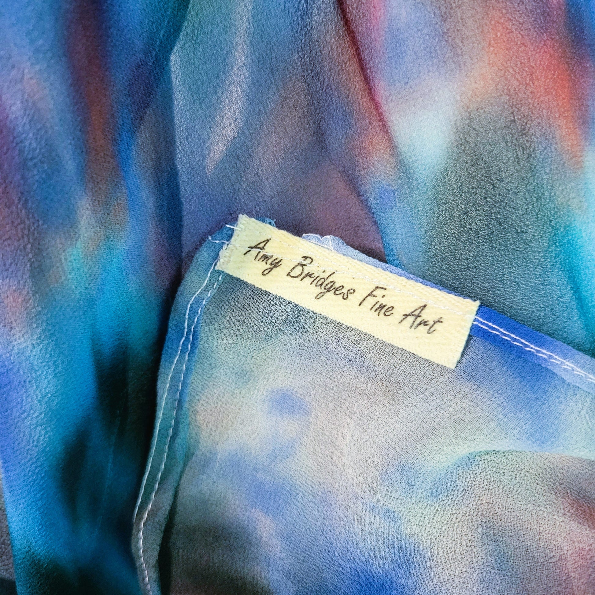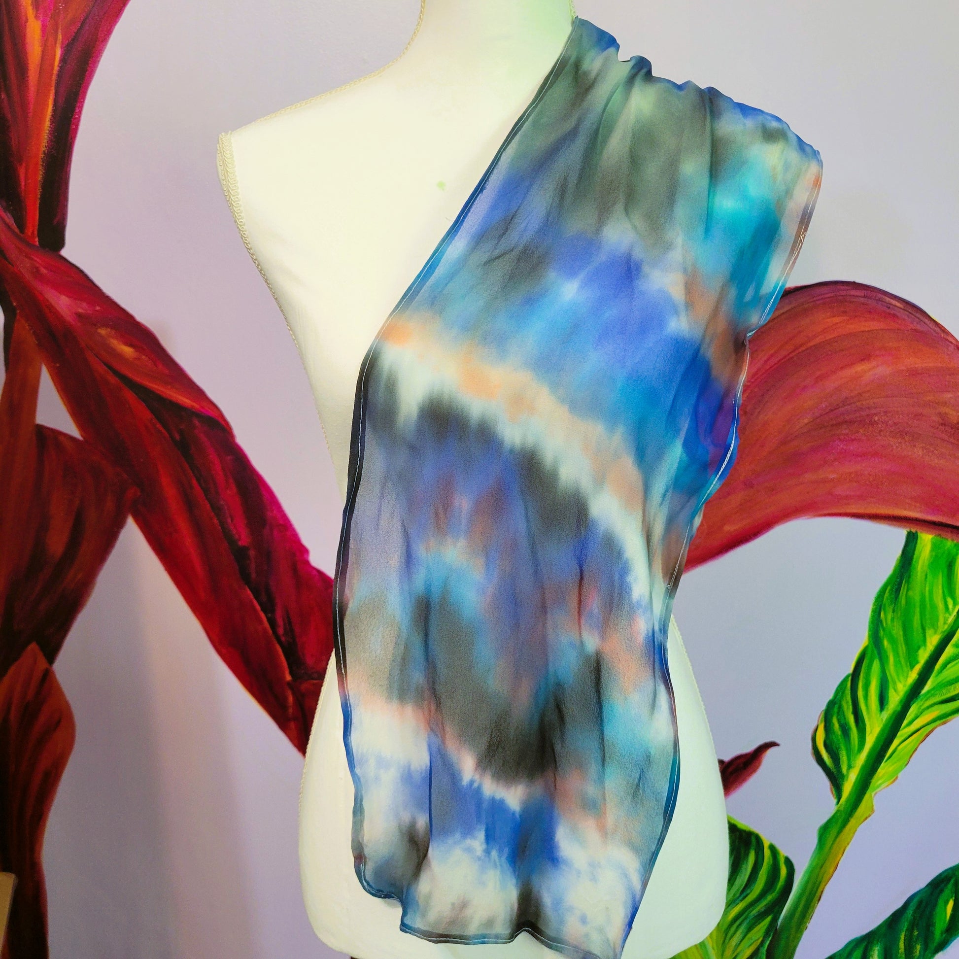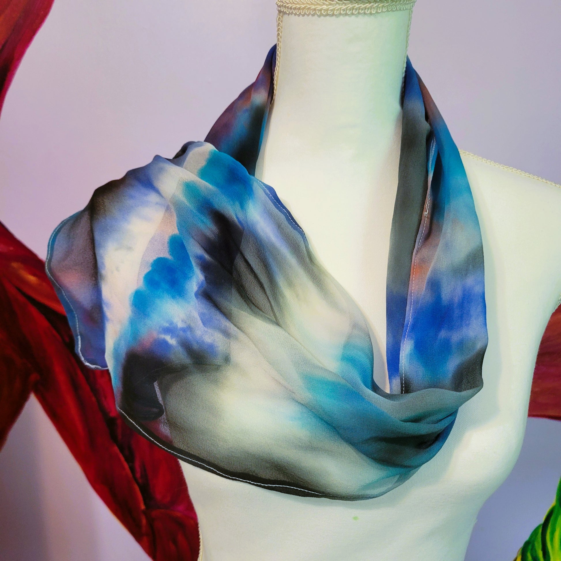 Elevate your style with this hand painted silk chiffon scarf, a one-of-a-kind wearable art piece. Crafted from luxurious sheer silk chiffon, this scarf features an abstract watercolor-inspired design in shades of blue, black, red, and white, created through a unique scrub-dye painting technique.