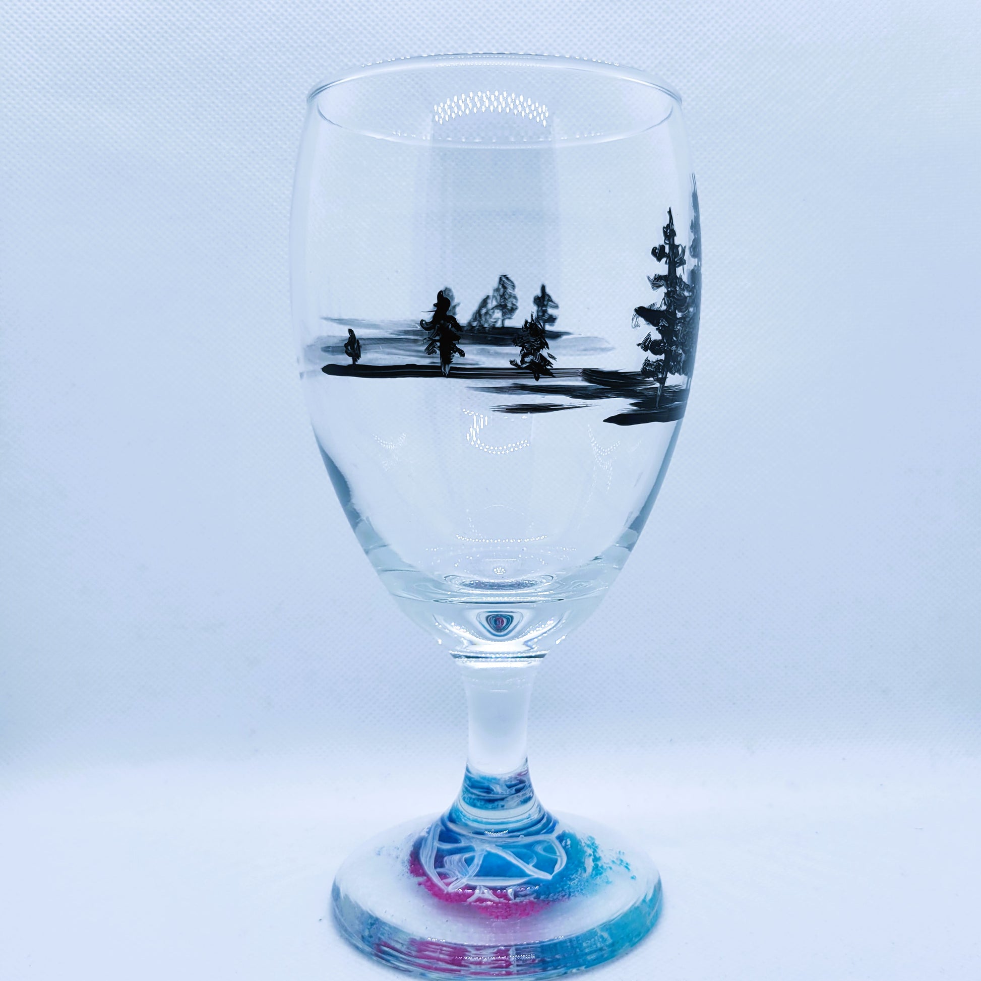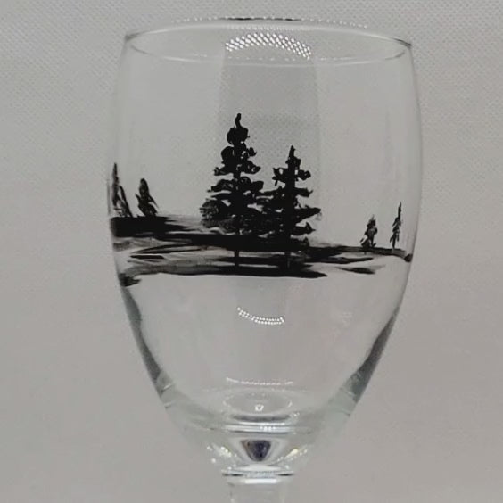 This 16oz goblet is hand-painted with a detailed black and white wrap-around landscape of a tree and a water feature. Enjoy your drinks with a unique statement piece.